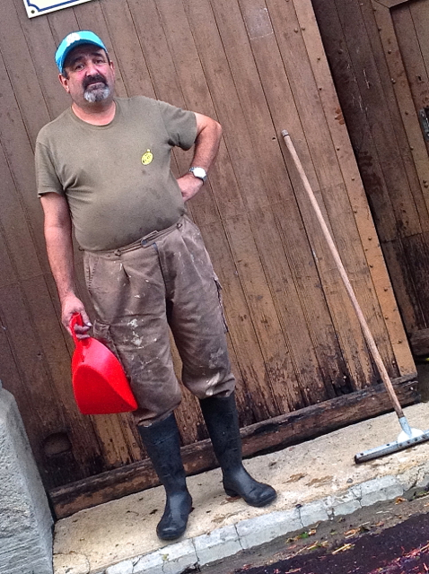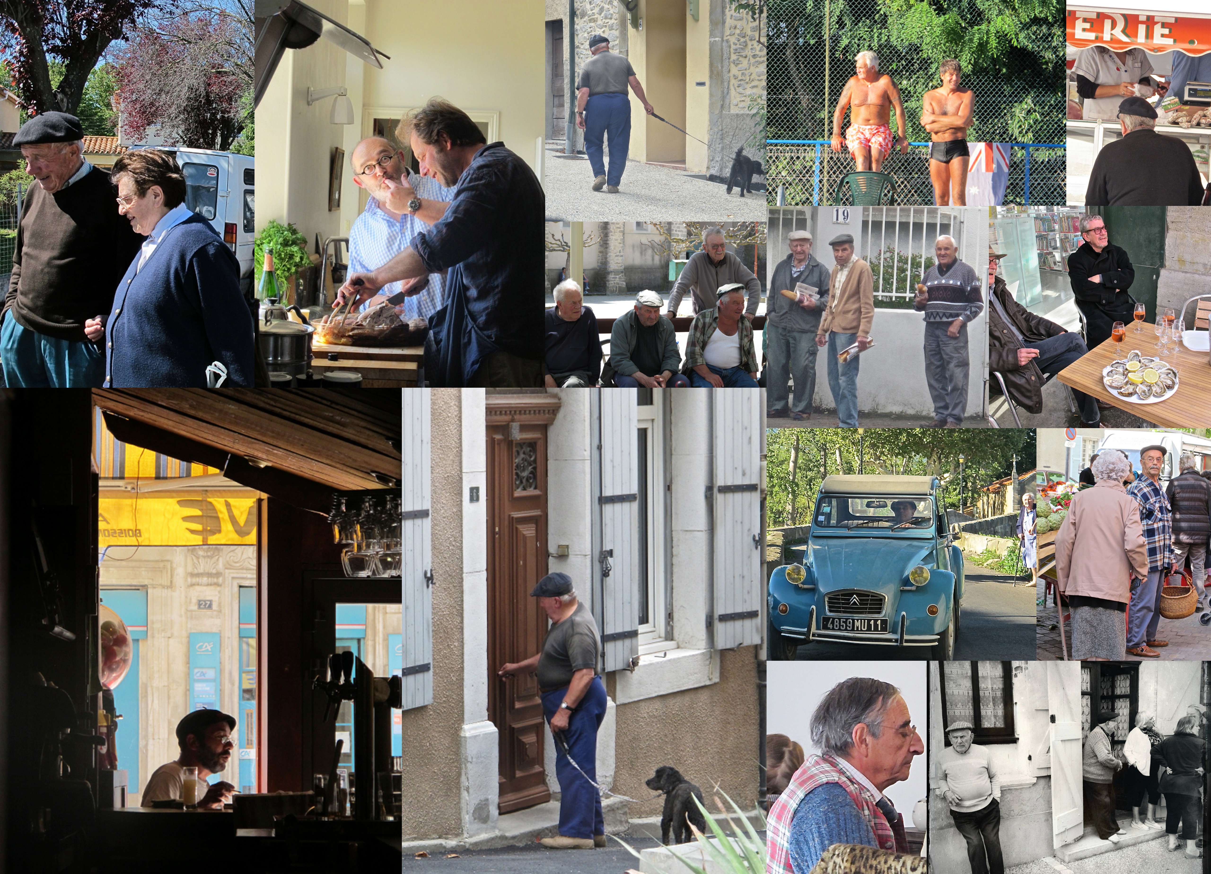 We were having dinner, Benji and me with friends of ours on holiday at the Cafe Occitan. There’s not many of us left – our table of 4 and a large, festive table of people from out of town celebrating a birthday. I head to the loo as we’re about to go, and as I’m walking back to our table, I hear the music has upped a few notches and see the birthday party has revved up with all the guests on their feet and dancing. A man from the group motions over to me and I plan a polite merci, non merci for an offer to dance. A second later he’s standing before me trying to explain over the noise that someone in his group wants to meet me, would this be ok. He brings over a lady whose face is beaming who tells me she wanted to meet the person whose photos had hung on the walls of this cafe, and had found out it was me. It’s been years since the photos came down, but she had remembered one in particular, the one of her father, sitting in his village in front of his home, with a beret on his head.