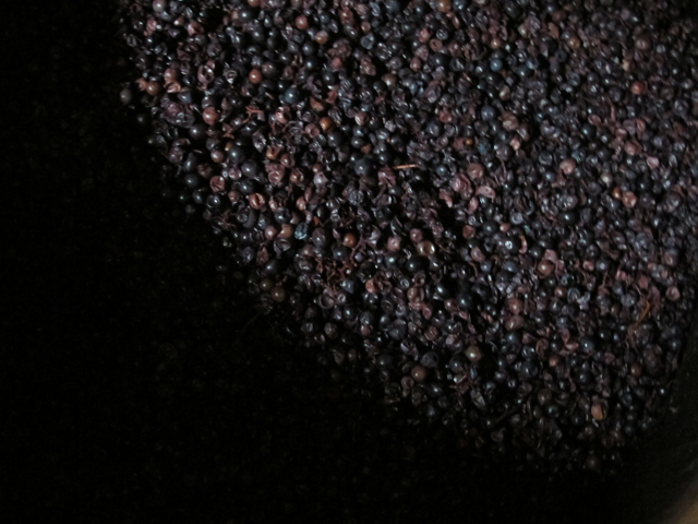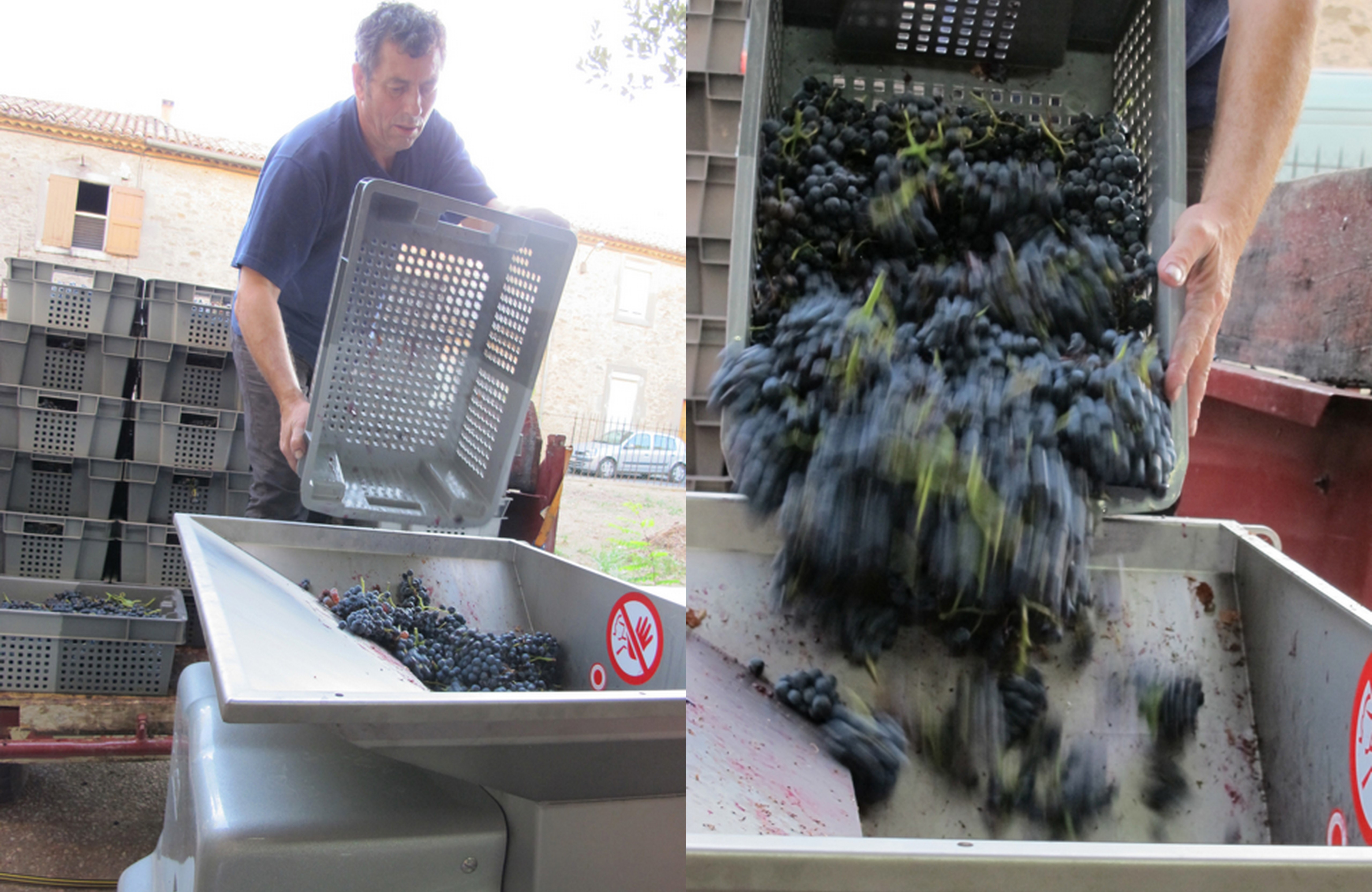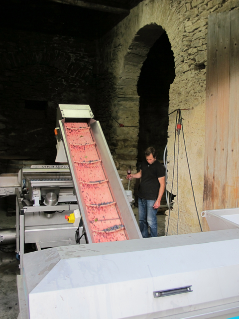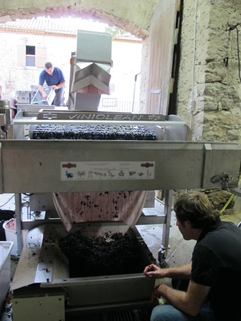 The grapes were carefully emptied from their ‘caisses’ (box/basket) one by one into the de-stemmer/crusher (yes, it does what it says, plucks the berries from their stems and sorts away the leaves) which then drops the glistening little purple ‘beads’ (they look like jewellery) onto the sorting tray. They are dropped down into another tray, with a huge turning ‘screw’ and then pumped up through the red hose, straight into the tank. Some of the grapes were collected into buckets and emptied directly into wine barrels (second-hand, so not full-blown wood influences on the juice). A small experiment to develop different flavours.