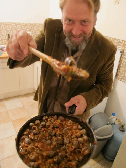 Now I should tell you that Geoff, as well as being token Aussie in his village, is also known as a damn fine snail catcher and cook. It’s a big tradition around here and once these little slimy creatures come out in force after a big rain, you hear much talk amongst the locals of ‘cagaraula’ (‘snails’ in local Occitan). Evonne had told me how good Geoff’s snails were and it was thanks to him that I got to try my third-ever* meal of ‘les escargots’…