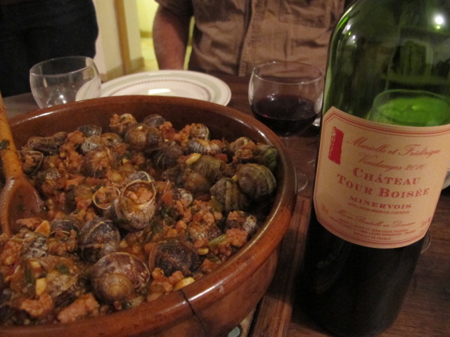 Escargots a La Minervoise and La Tour Boisee 2010 Minervois red