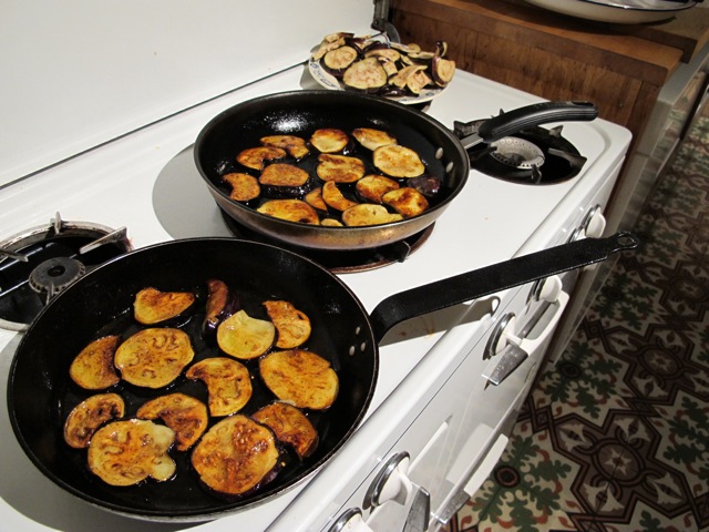 Once all the eggplant slices have been fried, I add them to the pot, taste for salt and then re-cover and leave simmering for another 20 minutes.