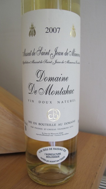 DOMAINE DE MONTAHUC MUSCAT – This organic muscat is from the tiny appellation of St Jean de Minervois (approx 135 inhabitants), situated in the Languedoc Roussillon region. IT’s an amzing environment up there, with the samll bush vines growing out of limestone rocks. But it’s a killer to pick there, crouched over low vines with the sun belting down on the white rock. It’s the idea of drinking the stuff that makes it all worthwhile. We were constantly being not to eat too many of the grapes! Delicious when chilled… the Domaine de Montahuc muscat de petits grains from St Jean de Minervois – my favourite region for muscat.